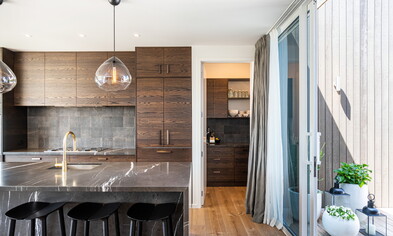 Engineered oak floors were laid throughout to give warmth underfoot. The kitchen was a mix of stone worktops and oak veneered cabinets to complement the flooring. This was carried on through to the large butler's pantry behind the kitchen.