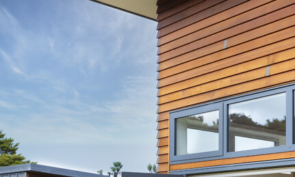 Complimenting the hard concrete surface is vertical cedar cladding to the rest of the house.