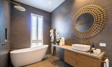 Bathrooms were tiled floor to ceiling to create a complete wet room with no glass divider screen for the shower. Ceilings heights of 2.7 and 3 meters throughout the house give a feeling of space.