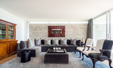 As you ascend to the top of the staircase, the large vaulted ceiling and view through the sliding doors never fails to impress and is the focal point of the living area.